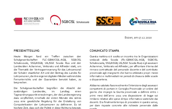 Die vier Schulgewerkschaften haben am 10. Februar 2021 folgenden Appell gemeinsam an den Landeshauptmann und die Landesregierung gerichtet… mehr lesen ...